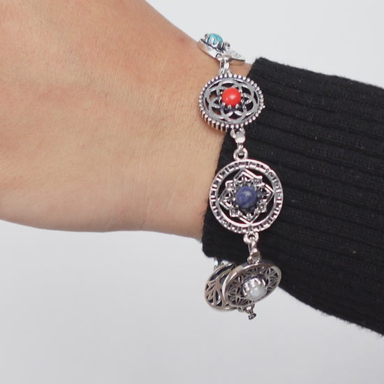 Infuse your style with spiritual elegance using these chakra-inspired mandala charm bracelets. Available in silver and gold finishes, each bracelet features intricately designed mandala motifs set with colorful gemstone-like beads symbolizing energy centers.