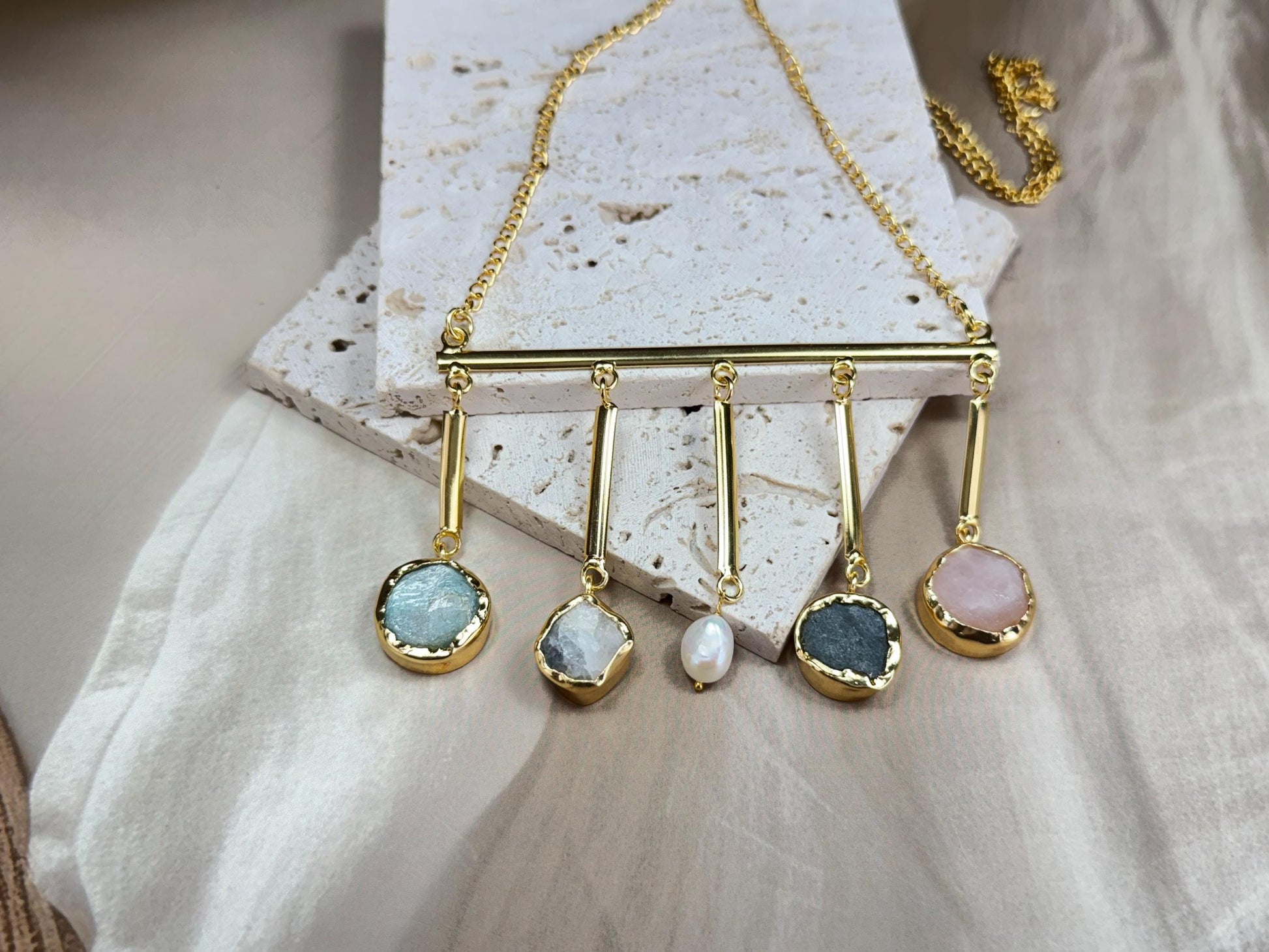 Bohemian Charm Necklace – Raw Natural Stones Drops on Gold Bar with Natural Pearl Accent.