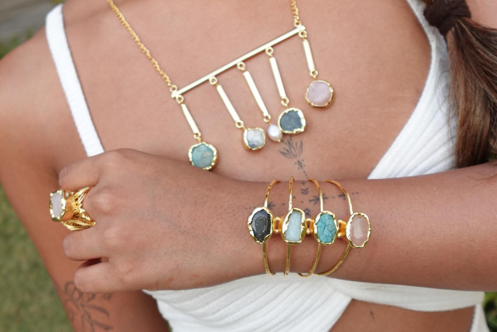 Each raw stone dangles from a handcrafted gold bar, making the necklace shimmer with movement and light. Whether you're layering with other pieces or letting it stand alone, this necklace makes a powerful statement.