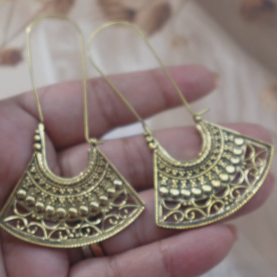 Fan-Shaped Tribal Brass Earrings - Unique fan-shaped mandala earrings with ethnic filigree details in brass.