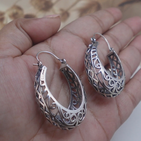 Filigree Brass Hoop Earrings – Crescent Drop Mandala Style.