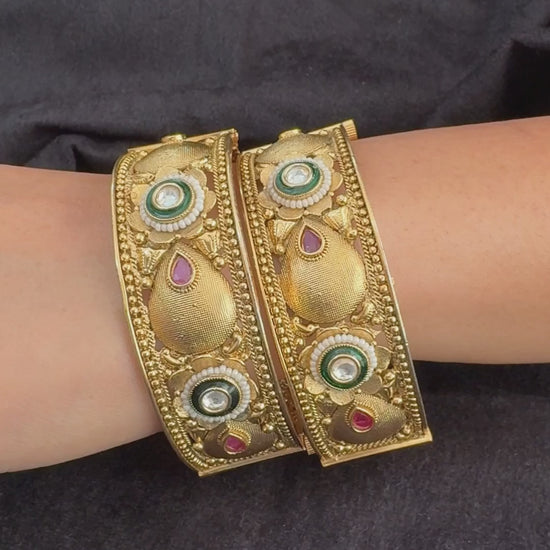 Green and White Bloom Kada Textured gold kada with round floral motifs, green center stones, and meenakari enamel detailing. Bridal-ready.