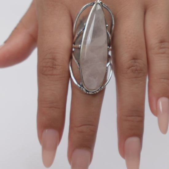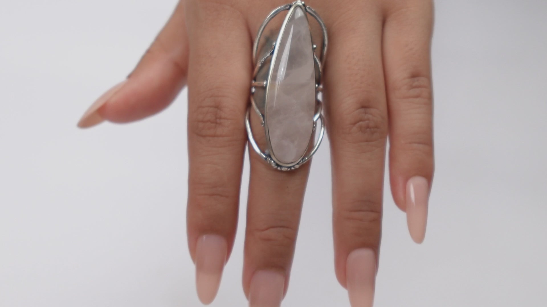 Rose Quartz: With its soft blush hue and calming aura, this ring channels love, tranquility, and divine feminine energy. Set in a silver-toned cage frame, it's a serene piece that radiates grace.