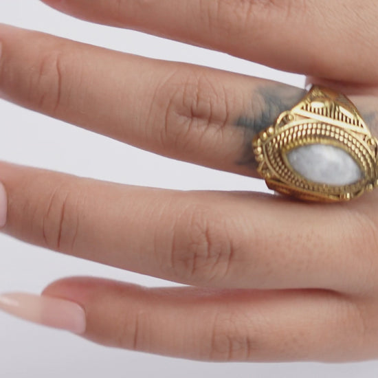 This stunning piece crafted in antique-finish brass and crowned with a marquise-cut moonstone at its center. Surrounded by intricate, symmetrical detailing and fine beading, this ring evokes the aura of an ancient talisman—powerful, protective, and full of story.
