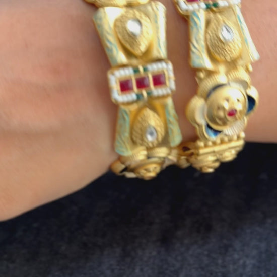 Enamel Rajwadi Bridal Kada with Polki & Ruby Detailing Handcrafted gold-polished kada with intricate enamel work and embedded polki and ruby stones.