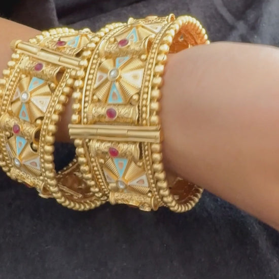 Royal Motif Bridal Kada with Enamel & Ruby Inlay - Vintage-style bangle with floral and geometric enamel patterns in a bold openable design.