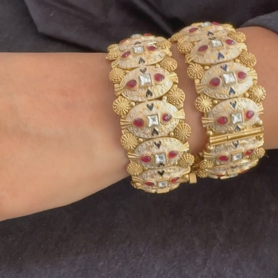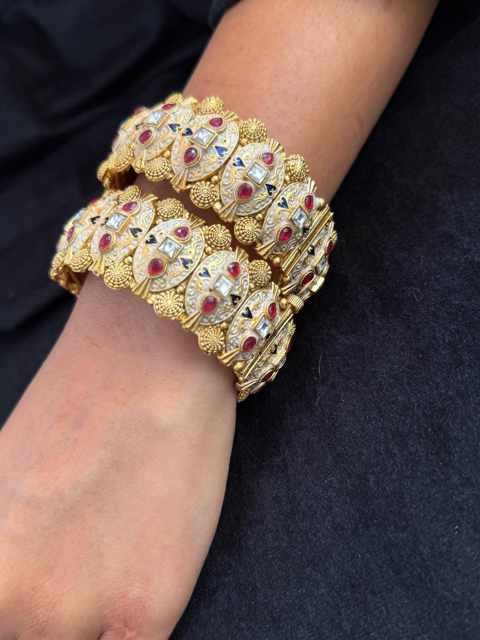 Pear-Cut Ruby and Meenakari Wedding Kada - Bridal bangles in matte gold featuring pear-cut rubies, meenakari detailing, and square stone insets.