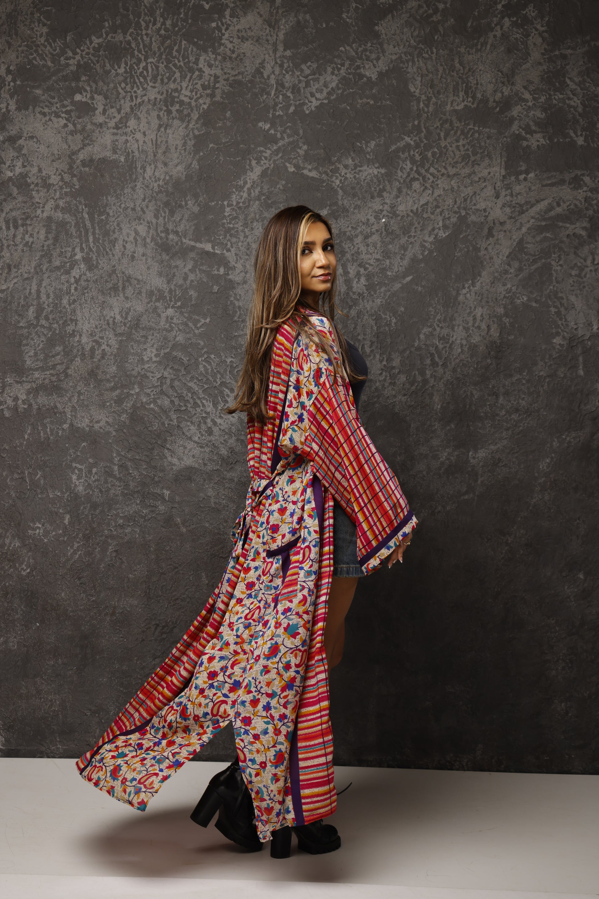 Wrap yourself in a story of culture and craftsmanship with our Saree Kimonos, a unique fusion of traditional Indian textiles and the timeless Japanese kimono silhouette. Each piece is thoughtfully handcrafted from upcycled sarees—vintage or pre-loved—making every kimono a one-of-a-kind treasure.
