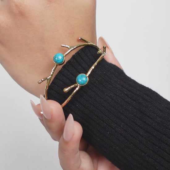 Turquoise/Moonstone Twig Open Brass Bangle Nature-inspired twig bangle with turquoise stones—bold and earthy.